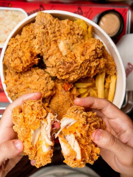 وجبة كريسبي مؤلفة من ٤ قطع مع سلطة روسية و بطاطا مقلية حمص ناعم مخلل مايونيز كاتشب